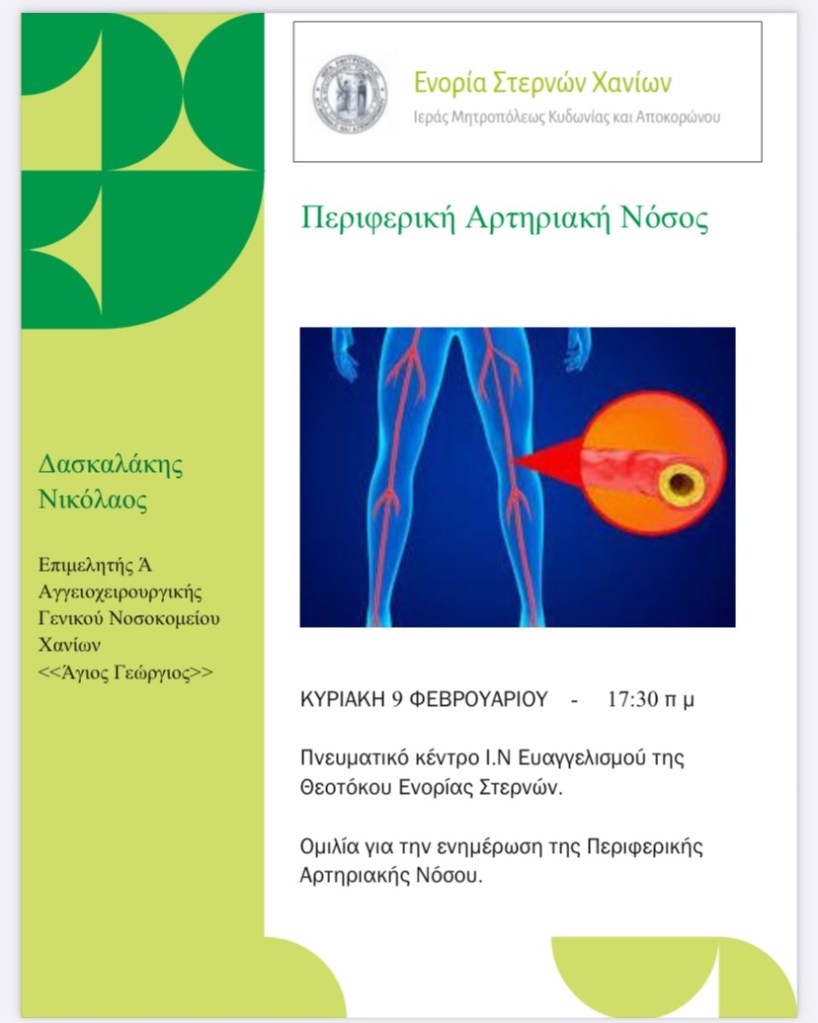 Ομιλητής θα είναι ο κ. Νικόλαος Δασκαλάκης, Επιμελητής Ιατρός της Αγγειοχειρουργικής Κλινικής του Γενικού Νοσοκομείου Χανίων “Άγιος Γεώργιος”, ο οποίος θα μοιραστεί μαζί μας πολύτιμες γνώσεις και πληροφορίες σχετικά με θέματα αγγειοχειρουργικής και φροντίδας της αγγειακής υγείας.
