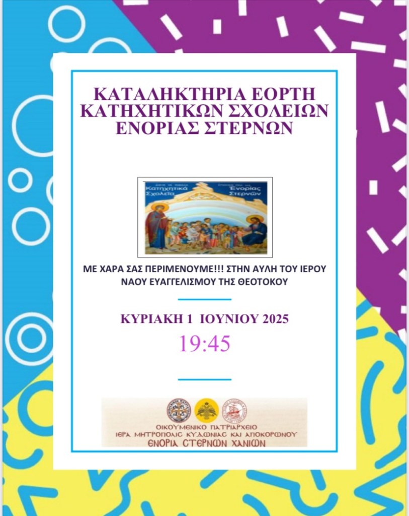 Μάϊος 29, 2025 ΕΝΟΡΙΑ ΣΤΕΡΝΩΝ ΧΑΝΙΑ Καταληκτήρια Εορτή Κατηχητικών Σχολείων Ενορίας Στερνών Μοιρασθῆτε το: Πατῆστε γιὰ νὰ μοιρασθῆτε στὸ X(Ἀνοίγει σὲ νέο παράθυρο) X Click to share on Facebook(Ἀνοίγει σὲ νέο παράθυρο) Facebook Πατῆστε γιὰ νὰ στείλετε τὸν σύνδεσμο σὲ ἕναν φίλο(Ἀνοίγει σὲ νέο παράθυρο) Email Μοῦ ἀρέσει Φόρτωση σὲ ἐξέλιξη...