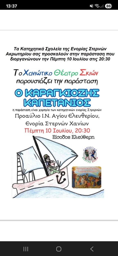Ἰούλιος 9, 2025Ἰούλιος 9, 2025 ΕΝΟΡΙΑ ΣΤΕΡΝΩΝ ΧΑΝΙΑ Πέμπτη 10 Ιουλίου 2025 Μοιρασθῆτε το: Πατῆστε γιὰ νὰ μοιρασθῆτε στὸ X(Ἀνοίγει σὲ νέο παράθυρο) X Click to share on Facebook(Ἀνοίγει σὲ νέο παράθυρο) Facebook Πατῆστε γιὰ νὰ στείλετε τὸν σύνδεσμο σὲ ἕναν φίλο(Ἀνοίγει σὲ νέο παράθυρο) Email Μοῦ ἀρέσει Φόρτωση σὲ ἐξέλιξη...