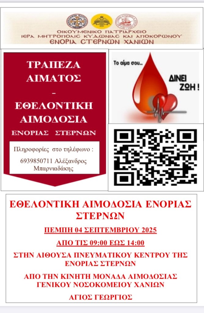 Η Ενορία Στερνών Χανίων ανακοινώνει τη διοργάνωση Εθελοντικής Αιμοδοσίας την Πέμπτη 4 Σεπτεμβρίου 2025 και ώρα 09:00 – 14:00, στην αίθουσα του Πνευματικού Κέντρου της Ενορίας, που βρίσκεται δίπλα στον κεντρικό Ιερό Ναό Ευαγγελισμού της Θεοτόκου Στερνών.