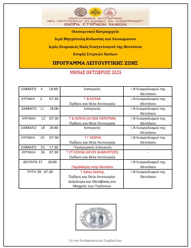 Ὀκτώβριος 3, 2025Ὀκτώβριος 3, 2025 ΕΝΟΡΙΑ ΣΤΕΡΝΩΝ ΧΑΝΙΑ Λειτουργικό Πρόγραμμα Οκτωβρίου Μοιρασθῆτε το: Πατῆστε γιὰ νὰ μοιρασθῆτε στὸ X(Ἀνοίγει σὲ νέο παράθυρο) X Click to share on Facebook(Ἀνοίγει σὲ νέο παράθυρο) Facebook Πατῆστε γιὰ νὰ στείλετε τὸν σύνδεσμο σὲ ἕναν φίλο(Ἀνοίγει σὲ νέο παράθυρο) Email Μοῦ ἀρέσει Φόρτωση σὲ ἐξέλιξη...