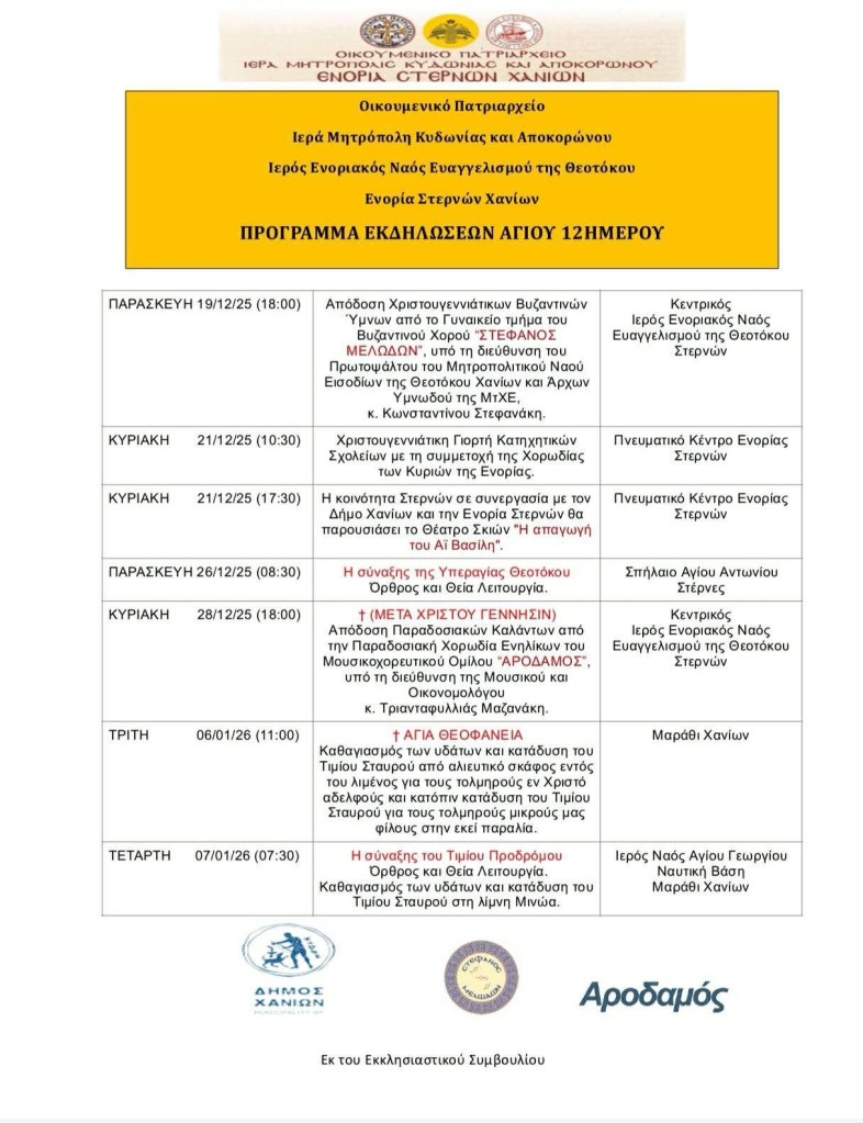 Δεκεμβρίου 10, 2025 ΕΝΟΡΙΑ ΣΤΕΡΝΩΝ ΧΑΝΙΑ Πρόγραμμα εκδηλώσεων Αγίου 12ημερου ! Μοιρασθῆτε το: Πατῆστε γιὰ νὰ μοιρασθῆτε στὸ X(Ἀνοίγει σὲ νέο παράθυρο) X Click to share on Facebook(Ἀνοίγει σὲ νέο παράθυρο) Facebook Πατῆστε γιὰ νὰ στείλετε τὸν σύνδεσμο σὲ ἕναν φίλο(Ἀνοίγει σὲ νέο παράθυρο) Email Μοῦ ἀρέσει Φόρτωση σὲ ἐξέλιξη...