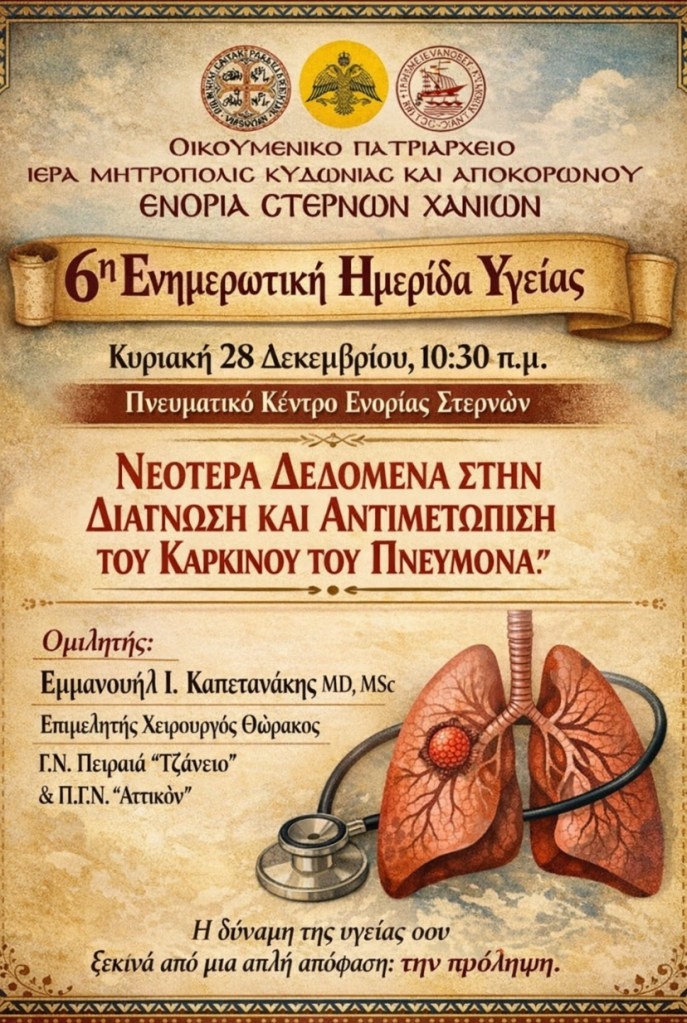 Η Ενορία Στερνών Ακρωτηρίου Χανίων συνεχίζει με συνέπεια τις δράσεις κοινωνικής προσφοράς και ενημέρωσης, διοργανώνοντας την 6η Ενημερωτική Ημερίδα Υγείας, την Κυριακή 28 Δεκεμβρίου 2025 και ώρα 10:30 π.μ., στο Πνευματικό Κέντρο της Ενορίας Στερνών.