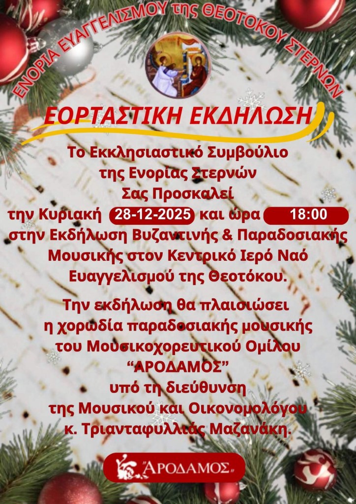 Δεκεμβρίου 25, 2025 ΕΝΟΡΙΑ ΣΤΕΡΝΩΝ ΧΑΝΙΑ Κυριακή 28-12-25 στις 18: 00 Εορταστική Εκδήλωση Βυζαντινής – Παραδοσιακής Μουσικής Μοιρασθῆτε το: Πατῆστε γιὰ νὰ μοιρασθῆτε στὸ X(Ἀνοίγει σὲ νέο παράθυρο) X Click to share on Facebook(Ἀνοίγει σὲ νέο παράθυρο) Facebook Πατῆστε γιὰ νὰ στείλετε τὸν σύνδεσμο σὲ ἕναν φίλο(Ἀνοίγει σὲ νέο παράθυρο) Email Μοῦ ἀρέσει Φόρτωση σὲ ἐξέλιξη...