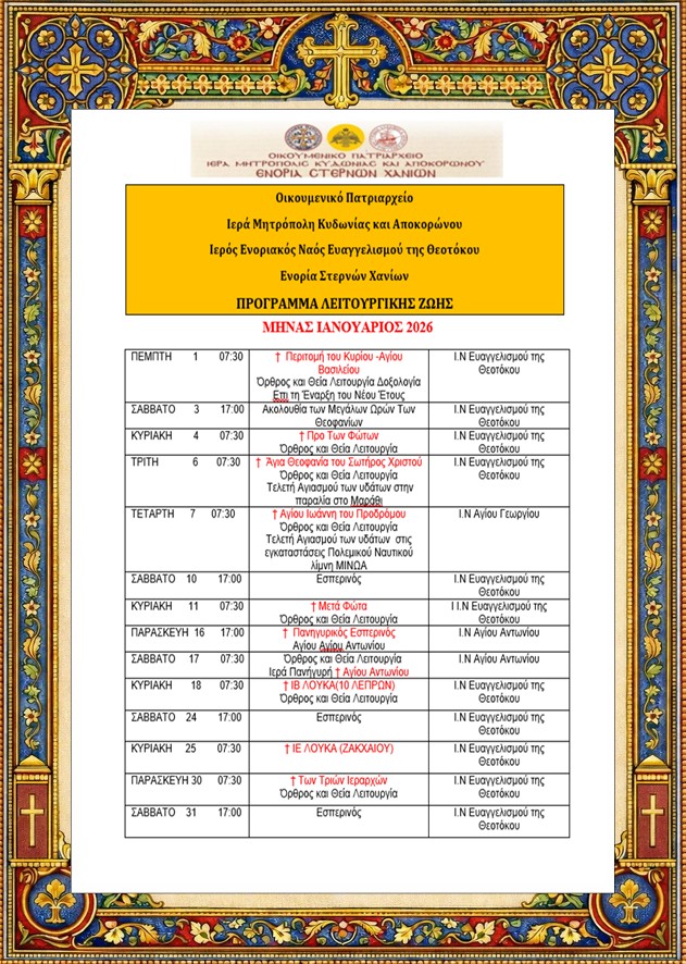 Δεκεμβρίου 30, 2025Δεκεμβρίου 31, 2025 ΕΝΟΡΙΑ ΣΤΕΡΝΩΝ ΧΑΝΙΑ Λειτουργικό Πρόγραμμα Ιανουαρίου 2026 Μοιρασθῆτε το: Πατῆστε γιὰ νὰ μοιρασθῆτε στὸ X(Ἀνοίγει σὲ νέο παράθυρο) X Click to share on Facebook(Ἀνοίγει σὲ νέο παράθυρο) Facebook Πατῆστε γιὰ νὰ στείλετε τὸν σύνδεσμο σὲ ἕναν φίλο(Ἀνοίγει σὲ νέο παράθυρο) Email Μοῦ ἀρέσει Φόρτωση σὲ ἐξέλιξη...