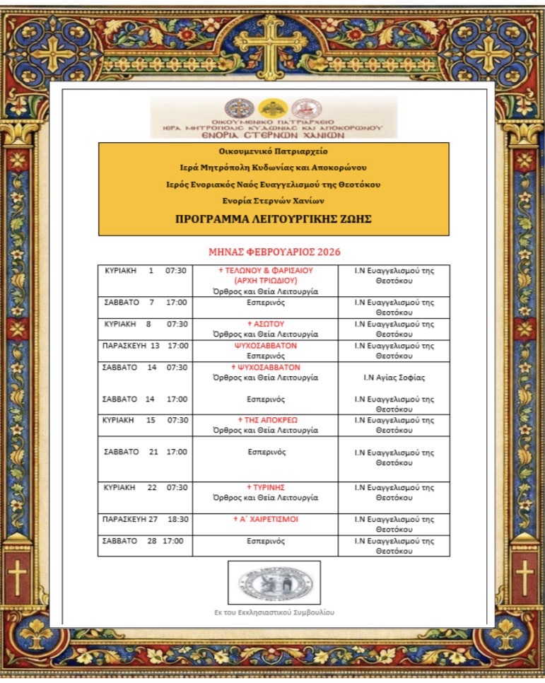 Ἰανουάριος 29, 2026Ἰανουάριος 30, 2026 ΕΝΟΡΙΑ ΣΤΕΡΝΩΝ ΧΑΝΙΑ Λειτουργικό Πρόγραμμα Φεβρουαρίου 2026 Μοιρασθῆτε το: Share on X(Ἀνοίγει σὲ νέο παράθυρο) X Μοιρασθῆτε το στὸ Facebook(Ἀνοίγει σὲ νέο παράθυρο) Facebook Email a link to a friend(Ἀνοίγει σὲ νέο παράθυρο) Email Μοῦ ἀρέσει Φόρτωση σὲ ἐξέλιξη...