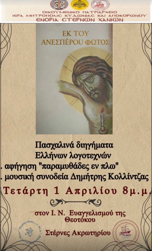 Μάρτιος 29, 2026 ΕΝΟΡΙΑ ΣΤΕΡΝΩΝ ΧΑΝΙΑ Πασχαλινά διηγήματα Ελλήνων Λογοτεχνών – Τέταρτη 1 Απριλίου 2026 στις 20:00 στον Ι.Ν Ευαγγελισμού της Θεοτόκου Ενορίας Στερνών . Μοιρασθῆτε το: Share on X(Ἀνοίγει σὲ νέο παράθυρο) X Μοιρασθῆτε το στὸ Facebook(Ἀνοίγει σὲ νέο παράθυρο) Facebook Email a link to a friend(Ἀνοίγει σὲ νέο παράθυρο) Email Μοῦ ἀρέσει Φόρτωση σὲ ἐξέλιξη...