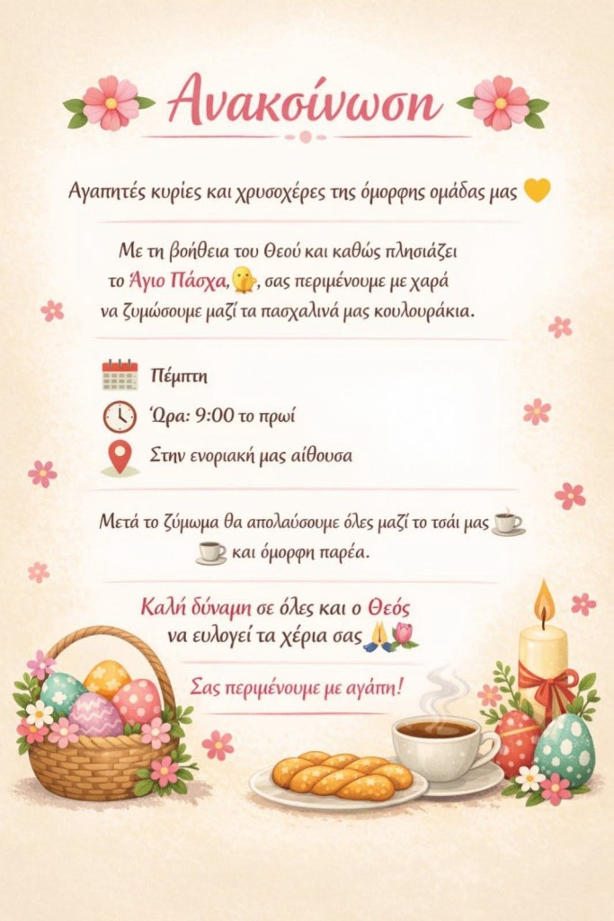 Ἀπρίλιος 1, 2026 ΕΝΟΡΙΑ ΣΤΕΡΝΩΝ ΧΑΝΙΑ Ανακοίνωση Καθώς πλησιάζει το Πάσχα , θα χαρούμε πολύ να βρεθούμε ξανά όλες μαζί για να ζυμώσουμε τα παραδοσιακά πασχαλινά μας κουλουράκια.Πέμπτη 2 Μαρτίουώρα 9:00 π.μΣτην ενοριακή αίθουσα Μοιρασθῆτε το: Share on X(Ἀνοίγει σὲ νέο παράθυρο) X Μοιρασθῆτε το στὸ Facebook(Ἀνοίγει σὲ νέο παράθυρο) Facebook Email a link to a friend(Ἀνοίγει σὲ νέο παράθυρο) Email Μοῦ ἀρέσει Φόρτωση σὲ ἐξέλιξη...