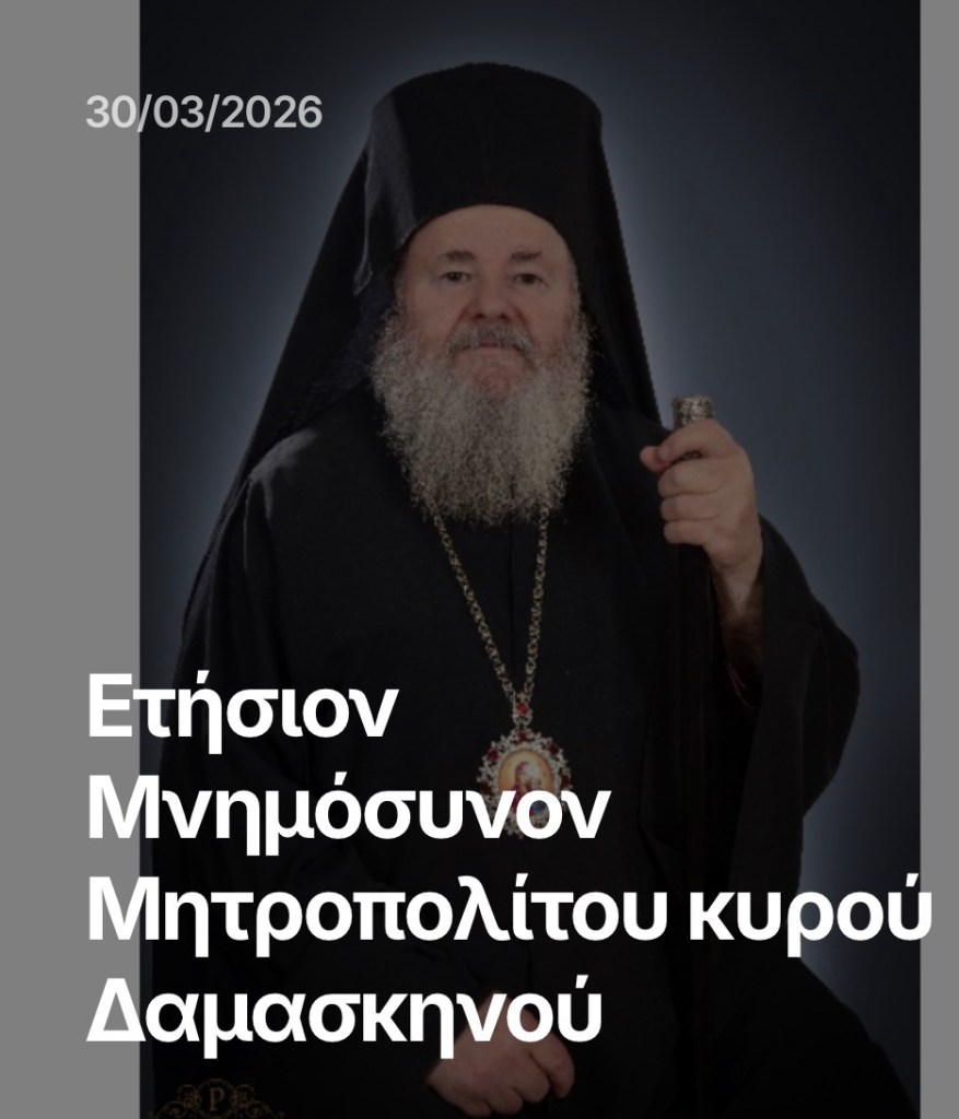 Ἐπί τῇ συμπληρώσει ἑνός ἔτους ἀπό τῆς πρός Κύριον ἐκδημίας τοῦ μακαριστοῦ Μητροπολίτου Κυδωνίας καί Ἀποκορώνου κυροῦ Δαμασκηνοῦ, θά τελεσθεῖ τό Σάββατο τοῦ Λαζάρου, 4 Ἀπριλίου ἐ.ἔ., Ἀρχιερατικό Μνημόσυνο στον Ἱερό Ναό τῶν Ἁγίων Πέτρου καί Παύλου, τῆς πόλεως τῶν Χανίων.