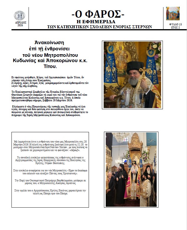 Ἀπρίλιος 8, 2026 ΕΝΟΡΙΑ ΣΤΕΡΝΩΝ ΧΑΝΙΑ ΕΦΗΜΕΡΙΔΑ – Ο ΦΑΡΟΣ – ΑΠΡΙΛΙΟΣ 2026 Μοιρασθῆτε το: Share on X(Ἀνοίγει σὲ νέο παράθυρο) X Μοιρασθῆτε το στὸ Facebook(Ἀνοίγει σὲ νέο παράθυρο) Facebook Email a link to a friend(Ἀνοίγει σὲ νέο παράθυρο) Email Μοῦ ἀρέσει Φόρτωση σὲ ἐξέλιξη...
